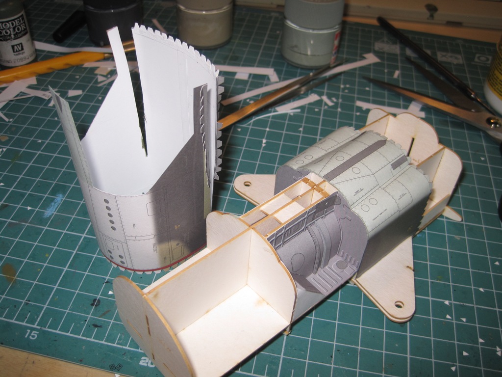 Paėmiau dėlioti karkasą iš lazeriu pjautų detalių. Visi formeriai išpjauti per maži. Reikia paklijuoti kartono, ant kurio atspausdintas modelis, juosteles. Nuotraukose į akis labai krenta nekokybiškas briaunų uždažymas. Reikės pasitempti.